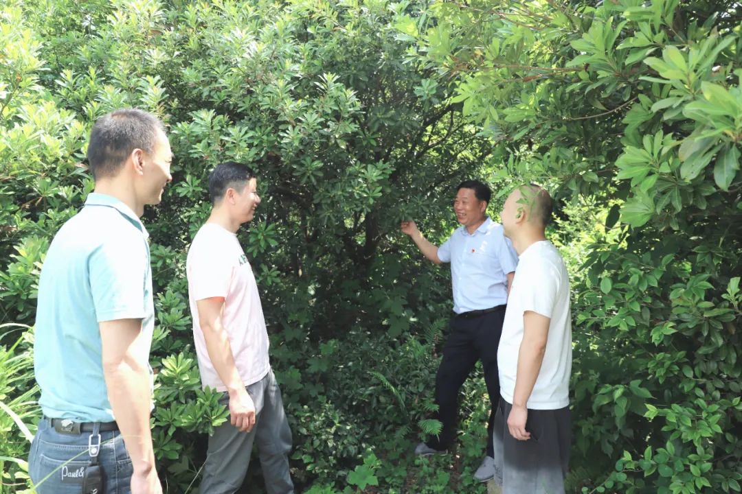 (圖為大田村村支書與駐村工作隊一起查看今年楊梅基地掛果情況)